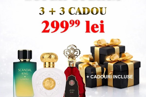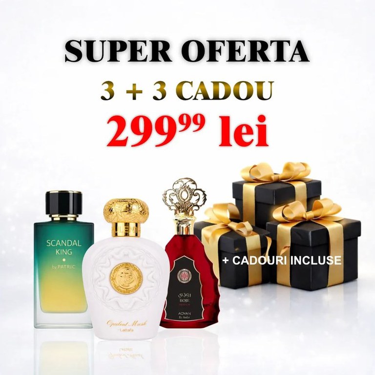 Profită de o ofertă specială și descoperă un pachet de parfumuri creat pentru cei care iubesc aromele persistente și elegante. La achiziția a 3 parfumuri, primești încă 3 parfumuri CADOU, fiind alegerea perfectă pentru tine sau pentru a oferi un cadou deosebit. Parfumurile din acest set sunt apreciate pentru persistența lor, notele dulci, orientale și elegante, potrivite atât pentru zi, cât și pentru seară. Cumpără 3 și primești încă 3 CADOU: Parfumuri incluse în pachet: Scandal King – parfum dulce-condimentat, puternic și seducător Opulent Musk – elegant, catifelat, cu note de mosc Roje Premium – parfum sofisticat, dulce-ambrat, persistent Parfumuri CADOU: 3 parfumuri surpriză, selectate din gama noastră de parfumuri bestseller De ce să alegi acest pachet: Primești 6 parfumuri la preț de 3 Persistență foarte bună Arome dulci, orientale, elegante Ideal pentru cadou Potrivit pentru orice sezon Raport calitate-preț excelent Tip produs: Apă de parfum Număr bucăți: 6 Cantitate: 100 ml / parfum Pentru: Bărbați & Femei Tip arome: Dulce, Oriental, Mosc, Ambrat