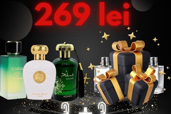 ✨ Pachet Super Promo 3 + 3 = 6 ✨ Cumperi 3 Primesti 6 Primești TREI PARFUMURI de 100 ml Cadou Surpriză la achiziționarea acestui pachet exclusiv! ? + 3 Parfumuri Surpriză de 100ml CADOU ? La acest pachet premium, primești trei parfumuri orientale de colecție, oferite CADOU pentru a-ți completa colecția de arome!