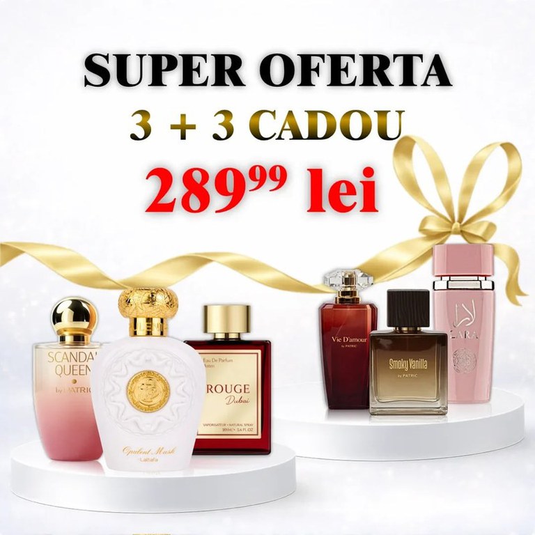 Un set complet de parfumuri feminine, creat pentru femeile care iubesc aromele dulci, elegante și persistente. Acest pachet conține 6 parfumuri diferite, potrivite pentru orice moment al zilei – de la parfumuri delicate și romantice, până la arome dulci, intense și senzuale. Este alegerea perfectă dacă vrei varietate, parfumuri care atrag complimente și persistență foarte bună pe piele și haine. Setul este ideal atât pentru uz personal, cât și pentru a fi oferit cadou. Pachetul conține: Scandal Queen – dulce, seducător, intens și feminin Opulent Musk – elegant, catifelat, cu note de mosc alb Rouge Dubai – dulce-ambrat, sofisticat și persistent Vie D'Amour – dulce, romantic, feminin Smoky Vanilla – dulce, vanilat, cald și persistent Lara Pink – floral-dulce, delicat și plăcut De ce să alegi acest set: 6 parfumuri diferite într-un singur pachet Persistență foarte bună Parfumuri dulci, florale și elegante Ideal pentru cadou Potrivite pentru orice sezon Raport calitate-preț excelent Perfect pentru femeile care vor varietate Tip produs: Apă de parfum Număr bucăți: 6 Cantitate: 100 ml / parfum Pentru: Femei Tip arome: Dulce, Floral, Mosc, Ambrat, Vanilat