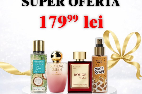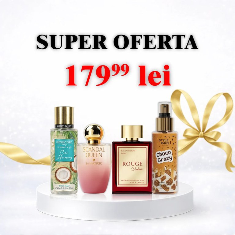 Un pachet special creat pentru iubitorii de parfumuri dulci, elegante și persistente. Setul conține 2 parfumuri bestseller și 2 body misturi gurmande, perfecte pentru layering – metoda prin care parfumul rezistă mai mult și miroase mai intens pe piele. Parfumurile oferă eleganță și persistență, iar body misturile completează perfect aroma cu note dulci de ciocolată și vanilie, pentru un miros irezistibil pe tot parcursul zilei. Pachetul conține: Scandal Queen – parfum dulce, seducător, feminin Rouge Dubai – parfum dulce-ambrat, elegant și persistent Choco Crazy – body mist cu aromă dulce de ciocolată Coco Harmony – body mist dulce, cu aromă de vanilie și cocos De ce să alegi acest set: Parfum + body mist pentru persistență mai mare Arome dulci și gurmande foarte apreciate Ideal pentru cadou Perfect pentru layering Potrivit pentru orice sezon Raport calitate-preț excelent Tip produs: Set Parfum + Body Mist Număr produse: 4 Cantitate parfum: 100 ml / buc Cantitate body mist: 250 ml / buc Pentru: Femei Tip arome: Dulce, Gurmand, Ambrat, Vanilie, Ciocolată