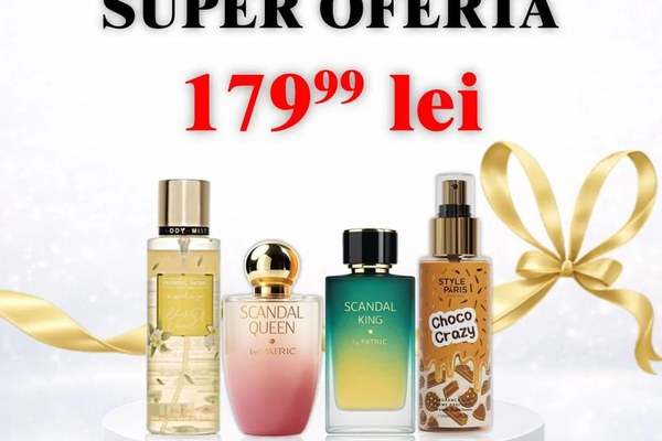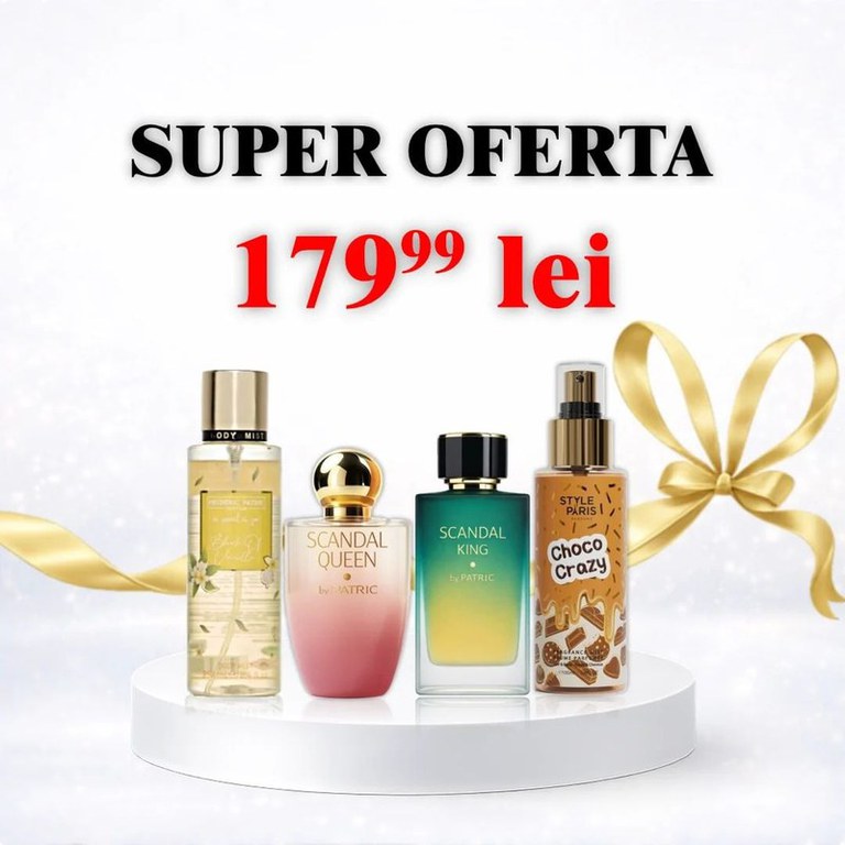 Un pachet perfect pentru cupluri sau pentru cei care iubesc parfumurile dulci și persistente. Setul conține 2 parfumuri intense și 2 body misturi gurmande, ideale pentru layering (aplicarea body mistului împreună cu parfumul pentru o persistență mai mare și o aromă mai intensă). Parfumurile sunt puternice, seducătoare și persistente, iar body misturile completează perfect parfumul cu note dulci de vanilie și ciocolată, oferind o aromă irezistibilă pe tot parcursul zilei. Pachetul conține: Scandal Queen – parfum dulce, seducător, feminin Scandal King – parfum dulce-condimentat, puternic, masculin Blink of Vanilla – body mist dulce, cu aromă intensă de vanilie Choco Crazy – body mist dulce, cu aromă de ciocolată De ce să alegi acest set: Parfum + body mist pentru persistență mai mare Arome dulci, gurmande, foarte apreciate Potrivit pentru cupluri Ideal pentru cadou Perfect pentru layering Raport calitate-preț foarte bun Tip produs: Set Parfum + Body Mist Număr produse: 4 Cantitate parfum: 100 ml / buc Cantitate body mist: 250 ml / buc Pentru: Femei & Bărbați Tip arome: Dulce, Gurmand, Vanilie, Ciocolată