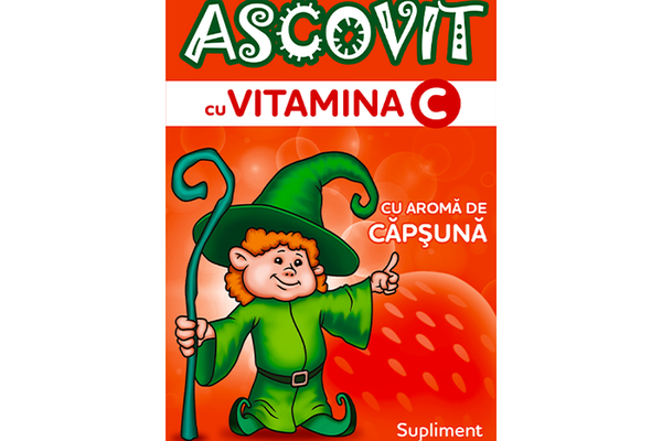 Supliment alimentar util in carenta de vitamina C, care poate sa apara la copii sau adulti datorita unei alimentatii necorespunzatoare.Vitamina C (acidul ascorbic) este un important factor vitaminic cu rol in biogeneza substantei intracelulare, intervenind in procesele metabolice de oxidoreducere, in metabolismul glucidelor, proteinelor si lipidelor. Are un puternic efect antioxidant, participand la distrugerea radicalilor liberi si ajuta la functionarea normala a sistemului imunitar, crescand rezistenta organismului la infectii. In plus, Vitamina C favorizeaza depunerea calciului in oase, intervenind in formarea colagenului si creste rezistenta capilarelor, fiind un excelent tonic al capilarelor.Ingrediente Ascovit:Vitamina C (acid ascorbic) 100 mg, 166,66% DZRExcipienti pentru un comprimat.%DZR= procent din doza zilnica recomandataMod de administrare Ascovit:Adulti: 1 comprimat/ziCopii: se va administra la recomandarea medicului de familie sau a medicului cu specialitatea pediatrie.Comprimatele se lasa sa se topeasca lent in gura sau se mesteca.