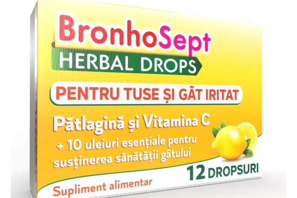 BronhoSept Herbal Drops, tuse și gât iritat, 12 dropsuri, Justin Pharma este un supliment alimentar creat pentru a calma iritațiile gâtului, a susține imunitatea și a îmbunătăți confortul respirator. Formula sa unică îmbină extractul de pătlagină, vitamina C și un amestec de 10 uleiuri esențiale recunoscute pentru efectele lor calmante, antibacteriene și expectorante.