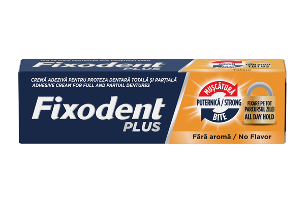 Utilizați Fixodent Plus Strong Bite pentru a ajuta la fixarea protezei dentare pentru întreaga zi, în special atunci când mâncați. Această cremă adezivă Premium este adaptată pentru proteze dentare complete și parțiale