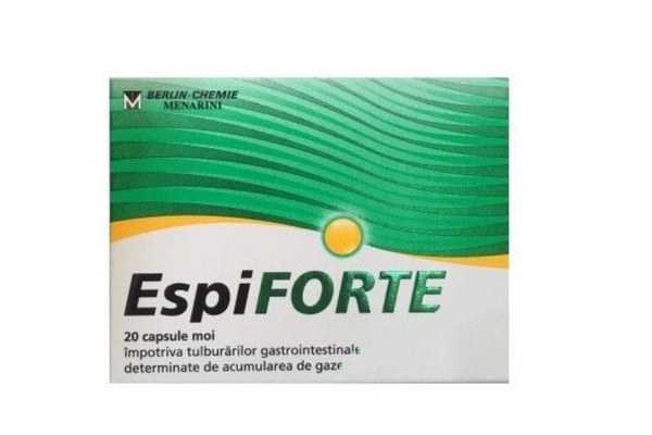 Este un dispozitiv medical ce se prezinta sub forma de capsule gelatinoase moi, pentru administrare orala, contine simeticona, o substanta cu proprietati antispumante.Utilizat in: tratamentul simptomatic al tulburarilor gastrointestinale determinate de acumularea de gaze, de exemplu, balonare (meteorism) sau flatulenta, senzatie de plenitudine; pregatirea in vederea examinarilor cu scop diagnostic, de exemplu, radiografie, ecografie si endoscopie.Ingrediente active per capsula EspiFORTE: Simeticona - 140 mg.Mod de administare EspiFORTE: Adulti si adolescenti cu varsta peste 14 ani. Pentru tulburari gastrointestinale provocate de acumularea de gaze: Doza unica - 1 capsula (echivalent a 140 mg simeticona); Doza zilnica - 3-5 capsule (echivalent a 420 – 700 mg simeticona). Pentru tulburari gastrointestinale provocate de acumularea de gaze: In ziua precedeanta examinarii - 1 capsula (echivalent a 140 mg simeticona); In ziua examinarii - 3-5 capsule (echivalent a 420 – 700 mg simeticona). Espi FORTE trebuie administrat in timpul sau dupa masa. Capsulele se inghit nemestecate, cu suficient lichid.