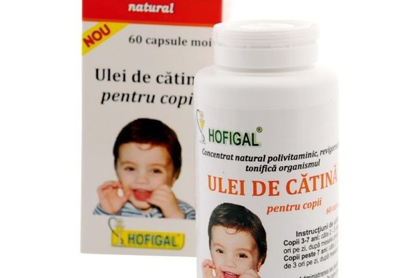 Supliment alimentar - revigorează şi tonifică organismul -Beneficii HOFIGAL Ulei de catina pentru copii:Tonifiant general, contribuie la stimularea capacităţiide apărare naturală a organismului;Trofic retinian eficient;Susţine sănătatea inimii şi este protector coronarian, îmbunătăţeşte circulaţia sanguină la nivelul capilarelor, fortifică pereţii vaselor de sânge;Protejează şi stimulează regenerarea mucoasei tubului digestiv;Are rol important în reglarea metabolismului;In caz de suprasolicitare fizică şi intelectuală intensă, stres, pentru înlăturarea stării de oboseală;Contribuie la menţinerea sănătăţii ţesuturilor, influenţând pozitiv procesele de regenerare tisulară.Ingrediente/capsula HOFIGAL Ulei de catina pentru copii:Ulei din fructe de Cătină (Hippophae rhamnoides), gelatină, glicerină și apă purificată.Datele de literatură scot în evidenţă că, uleiul de cătină - este un concentrat natural bogat în fitonutrienţi şi substanţe bioactive, în principal b-caroteni, vitaminele D, E, F, K, produşi polifenolici cu activitate puternic antiinflamatoare, lecitine sub formă uşor asimilabilă (săruri de calciu şi magneziu), acizi graşi polinesaturaţi din care acidul gamma-linolenic precursor al multor enzime organice, aminoacizi liberi şi microelemente (Alam Zeb in: Important therapeutic uses of sea buckthorn (Hippophäe): A review, 2004).Produsul este bine tolerat, fără contraindicaţii semnalate până acum la dozele şi ritmul de administrare recomandate.În sarcină şi perioada de alăptare, precum şi la copii până la vârsta de 3 ani este necesară recomandarea specialistului.La apariţia unor efecte nedorite se întrerupe administrarea produsului şi se recomandă consultarea medicului sau farmacistului.Mod de administrare HOFIGAL Ulei de catina pentru copii:Adulţi: câte 1 - 2 capsule de 600 mg de 3 ori pe zi sau câte 1 - 2 capsule de900 mg de 2 ori pe zi.Copii de 3 – 7 ani: câte 2 – 3 capsule de 300 mg de 2 ori pe zi după mesele principale.Copii peste 7 ani: câte 2 - 4 capsule de 300 mg de 3 ori pe zi după mesele principale.Administrarea se poate face permanent sau în cure prelungite.Produsul este un supliment alimentar şi nu trebuie să înlocuiască o dietă variată şi echilibrată şi un stil de viaţă sănătos.Condiţii de păstrare:A se păstra la temperatura camerei (15-25°C), ferit de umiditate şi lumina directă a soarelui, în ambalajul original !A nu se depăşi doza recomandată pentru consumul zilnic!A nu se utiliza după data de expirare înscrisă pe ambalaj !A nu se lăsa la îndemâna şi vederea copiilor mici!