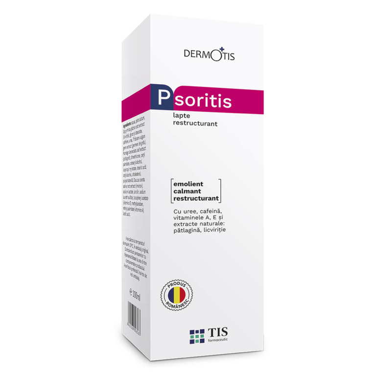 PsoriTIS lapte restructurant are acțiune hidratantă, emolientă și regenerantă asupra pielii îngroșate, afectată de deshidratare și scuame, din cauza procesului de diviziune celulară dereglat.
