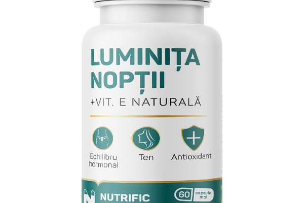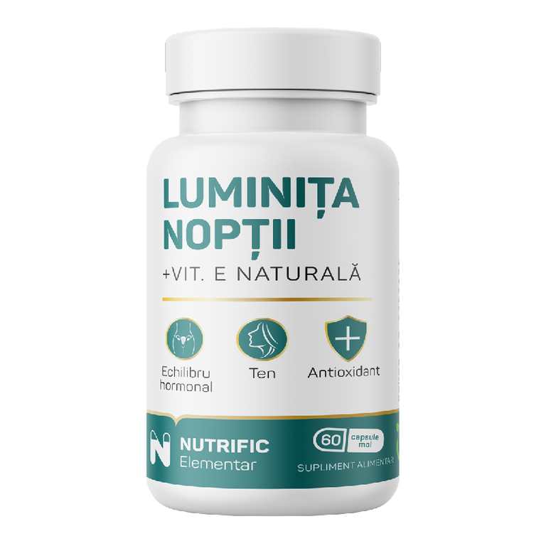 Luminita noptii + Vit. E naturala din gama Nutrific Elementar este un supliment alimentar cu eficienta maxima, 100% natural, produs in Romania din ingrediente validate stiintific. Combinatia eficienta de ulei de Luminita noptii (Oenothera biennis) presat la rece, cu continut 10% GLA 1000 mg si vitamina E naturala este benefica in principal pentru reglarea dezechilibrelor hormonale, imbunatatirea aspectului pielii si parului, intarirea sistemului imunitar.