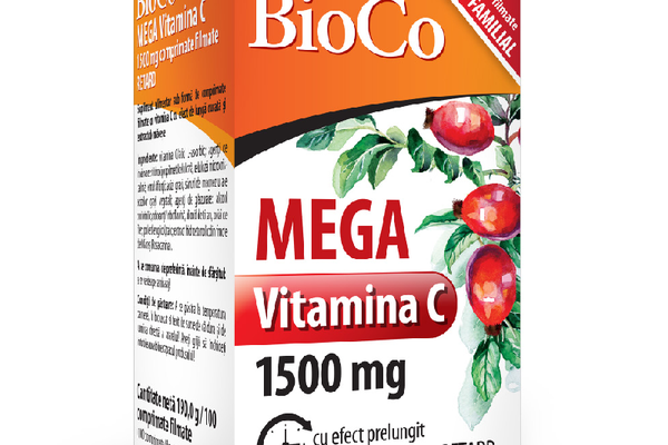 Supliment alimentar sub formă de comprimate filmate cu vitamina C cu efect de lungă durata și extract de măceșe. Vitamina C cu cel mai mare conținut de substanță activă dintre produsele BioCo, care conține 1500 mg de vitamina C pe comprimat filmat, combinată cu un efect de eliberare prelungită. Datorită acestui efect, conținutul de vitamina C al produsului va fi eliberat treptat în organism, astfel încât să putem asigura în mod continuu organismului nostru necesarul de vitamina C.
