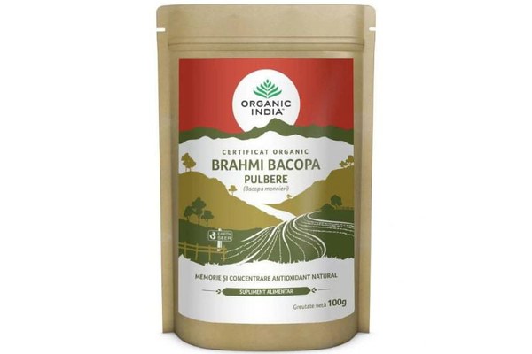 ORGANIC INDIA Brahmi Bacopa Pulbere Memorie si Concentrare Antioxidant Natural 100g este un produs 100% Certificat Organic si nu contine organisme modificate genetic. Nu contine si nu sunt folosite in niciun stagiu al productiei pesticide sintetice, erbicide, ingrasaminte sau alte tratamente chimice.Bacopa monnieri, cunoscuta si ca Brahmi, isop de apa si planta a gratiei, este o planta de baza in medicina traditionala Ayurveda. Creste in medii umede, tropicale. Bacopa monnieri a fost folosita de secole de catre specialistii Ayurveda pentru o varietate de beneficii, precum imbunatatirea memoriei, reducerea anxietatii si tratarea epilepsiei. Cercetarile moderne arata ca poate stimula functia creierului si poate atenua anxietatea si stresul. Se crede ca de aceste beneficii este responsabila o clasa de compusi chimici naturali numiti bacozide.