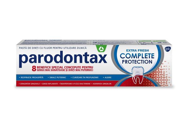 Pasta de dinti parodontax Complete Protection Extra Fresh are 8 beneficii speciale prevazute pentru a ajuta la mentinerea gingiilor sanatoase si dintilor puternici. In plus, ea are un gust proaspat si mentolat.