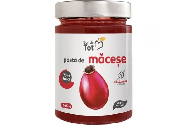 Pasta de macese Bun de Tot reinvie reteta autentica cu ingrediente 100% naturale, si aduce mai aproape savoarea proaspata a maceselor. Indulcita cu suc de struguri si cu un continut de 75g fruct / 100g, dulceata Bun de Tot este ideala pentru un mic dejun sanatos, o gustare usoara intre mese sau un desert delicios.