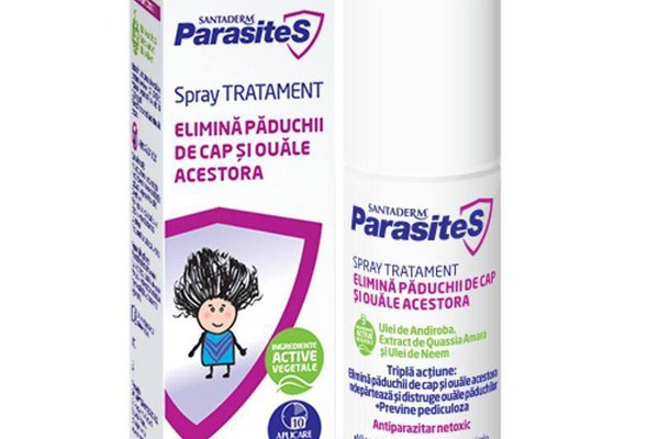 Santaderm Parasites spray tratament paduchi este testat clinic si s-a dovedit a fi un tratament eficace impotriva paduchilor de cap si oualor acestora.Indeparteaza si distruge formele vii si ouale paduchilor si previne pediculoza.Santaderm Parasites spray tratament paduchi nu contine insecticide de natura chimica, prin urmare paduchii de cap nu pot dezvolta rezistenta la ingredientele sale.Santaderm Parasites spray tratament paduchi poate fi utilizat pentru tratamentul pediculozei si pentru a preveni infestarea cu paduchi si lindeni.Fara insecticide.3 esente vegetale : - Ulei de Andiroba. - Extract de Quassia Amara. - Ulei de Neem.Mod de utilizare Santaderm Parasites spray tratament paduchi:Se tine spray-ul la aproximativ 10 cm distanta de par si se pulverizeaza uniform, cu atentie, o cantitate suficienta de solutie SantaDerm ParasiteS pe parul uscat. Se umezeste tot parul si scalpul. Apoi se maseaza bine de la radacini spre varfuri, acordand o atentie deosebita zonei cefei si celei din spatele urechilor. A se lasa sa actioneze timp de 10-15 minute. Se spala parul cu samponul SantaDerm ParasiteS pentru paduchi sau cu un sampon obisnuit si se clateste bine. Se spala din nou, daca este necesar.