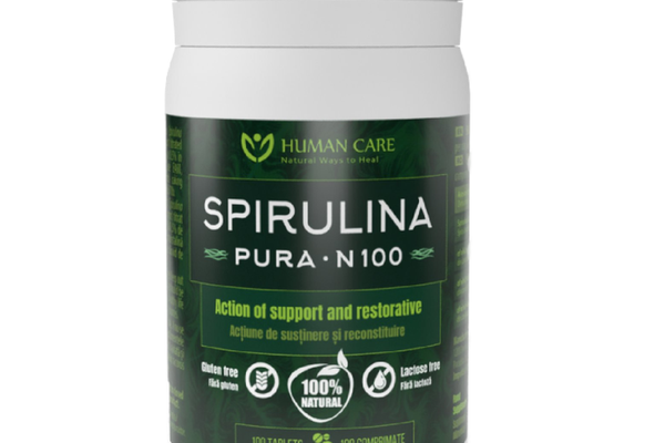 „Spirulina Pura” de la Human Care este un supliment alimentar sub formă de comprimate, bazat pe alga Spirulina platensis, recunoscută pentru conținutul său bogat în proteine, ficocianină și carotenoizi.