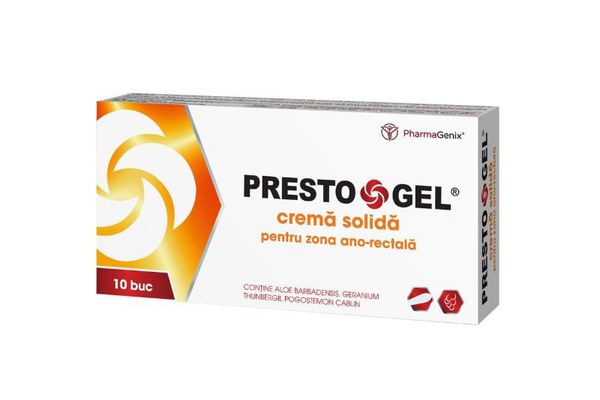 PrestoGel® Supozitoare*10 bucati contine ingrediente naturale indicate in tratamentul si prevenirea hemroizilor si fisurilor anale. PrestoGel® Supozitoare*10 bucati este un produs revolutionar bazat pe o formula unica de ingrediente active naturale, recomandata in ameliorarea simptomelor si tratarea hemoroizilor si a fisurilor anale. Acesta se gaseste sub forma unei creme solide destinata afectiunilor aparute in zona ano-rectala si actioneaza prin oprirea sangerarilor, eliminarea durerii, reducerea pruritului si prin indepartarea senzatiei de arsura.