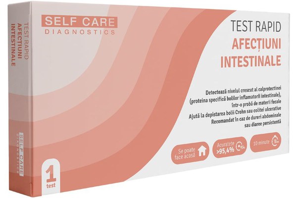 Testul rapid afectiuni intestinale - un test imunologic, usor de facut acasa, in orice moment al zilei.Depisteaza in 10 minute, intr-o proba de materii fecale, afectiunile intestinale, prin detectarea nivelului crescut al calprotectinei.Rezultatul testului este determinat de prezenta calprotectinei in proba de scaun, atunci cand concentratia acesteia per gram de materii fecale depaseste 50 μg.Pentru mai multe detalii consultati sectiunea de Prospect.