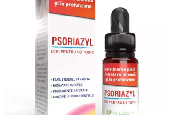Uleiul Psoriazyl, 30 ml, Justin Pharma poate sa fie un adjuvant in ameliorarea aspectului rosiatic, al rugozitatilor, iar prin hidratarea intensa oferita se impiedica formarea scuamelor.