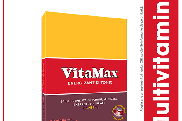 Vitamax conține grupe de ingrediente active, atent selectate pentru acțiunile lor sinergice, profilactice și terapeutice, necesare menținerii și/sau ameliorării funcțiilor organismului. Lăptișorul de matcă este un amestec natural de proteine, aminoacizi, lipide, carbohidrați, acizi grași și vitamine. A fost folosit cu rezultate deosebite ca tonic general în ameliorarea simptomelor legate de vârstă înaintată și pentru îmbunătățirea stării generale la cei cu boli cronice degenerative. Ginseng este, de asemenea, un extract natural cu un spectru larg de acțiuni farmacologice, cu efect stimulant și energizant. Ginseng crește rezistența naturală, ca și capacitatea recuperativă a organismului. Cele 9 bioelemente asigură organismului substanțele de bază necesare proceselor metabolice normale. În plus, aceste 9 bioelemente acționează ca factori de protecție împotrivă multor boli degenerative. Cele 23 din cele mai importante vitamine, minerale și oligoelemente sunt incluse pentru asigurarea necesarului zilnic atât în condiții normale, cât și în stări de deficit sau de necesitați crescute. Multe dintre acestea sunt cofactori în diferite procese metabolice. Ca urmare, Vitamax, prin compoziția sa, este considerat cel mai potrivit preparat vitaminic pentru toate vârstele, indiferent de sex.Ingrediente Vitamax:Capsule conținând: Lăptișor de matcă 10 mg, Ginseng 40 mg, Polen 50 mg, Ulei de grâu încolțit 50 mg, Fosfatide din soia 90 mg, Ulei de floarea soarelui 30 mg, Arginina 20 mg, Lizina 20 mg, Acid orotic 10 mg, Biotină 3 mcg, Dimetilaminoetanol bitartrat 25 mg, Vit. A (palmitat) 2 000 i.u., Colecalciferol 200 i.u., Vit. E 10 mg, Vit. B1 15 mg, Vit. B2 3 mg, Vit. B6 2 mg, Vit. B12 5 mg, Ac. folic 25 mg, Pantotenat de calciu 3 mg, Nicotinamidă 15 mg, Ac. 4-aminobenzoic 50 mg, Ac. ascorbic 50 mg, Fier 10 mg, Calciu 50 mg, Fosfor 38,6 mg, Potasiu 2 mg, Cupru 1 mg, Zinc 1 mg, Mangan 1 mg, Magneziu 1 mg, Iod 50 mcg, Seleniu 50 mcg, Fluor 1 mg (stripsuri cu 5 buc.; cutii cu 15 buc.).Vitamax este indicat ori de câte ori starea mentală sau fizică trebuie susținută: tratamentul oboselii, slăbiciunii, epuizării; ameliorarea eficienței mentale și intelectuale și combaterea tulburărilor de concentrare; ameliorarea rezistenței organismului la infecții; pentru scurtarea perioadei de convalescență după diverse boli, intervenții chirurgicale, radioterapie; pentru creșterea performanței fizice, în special la atleți; în tratamentul menopauzei și al impotenței psihogene; pentru întârzierea proceselor degenerative ale îmbătrânirii; pentru alinarea tensiunilor datorate surmenajului; ca parte integrantă a tratamentului: neurasteniei și nevritelor, anemiilor prin deficite nutriționale, afecțiunilor hepatice, artritelor, ulcerului gastro-intestinal, hiperlipidemiei, diabetului, distrofiilor pielii și anexelor cutanate, părului și unghiilor; în timpul sarcinii și al lactației; pentru inducerea stării de confort și stabilitate.Mod de administrare Vitamax:În absența unor prescripții medicale speciale, doza uzuală este de o capsulă zilnic sau la două zile, după masă administrata cu o cantitate suficienta de apa. în cazuri severe, doza poate fi crescută conform recomandării medicului.Precauții:Nu sunt necesare.Sarcină și alăptarea:Se recomandă și cereți sfatul medicului înainte de a utiliza Vitamax.