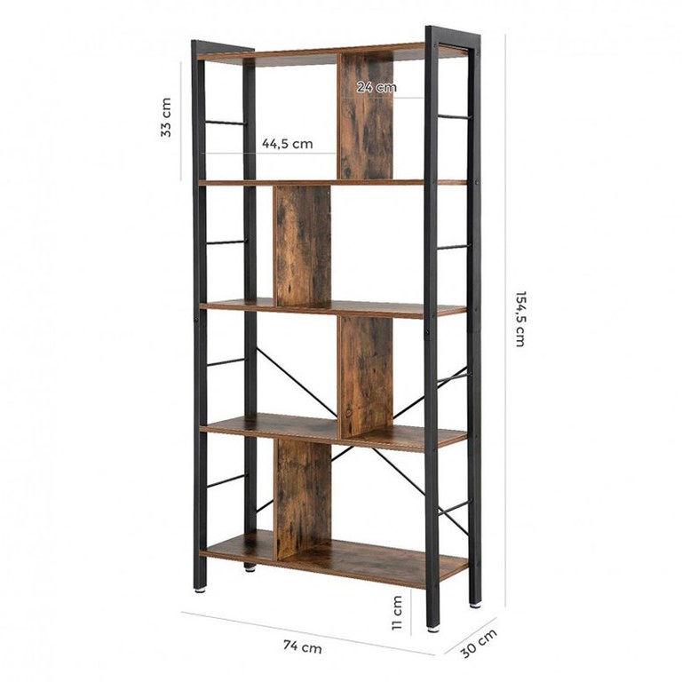 - Culoare: Maro rustic - Materiale: Plăci PAL, Fier - Dimensiune produs: 74 x 30 x 154,5 cm (L x l x H) - Greutate produs: 22,8 kg - Max Capacitate de încărcare statică per raft: 25 kg Conținutul pachetului: - 1 x Raft pentru cărți - 1 x Kit de accesorii - 1 x Instrucțiuni (EN, DE, FR, ES, IT)