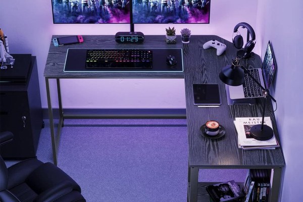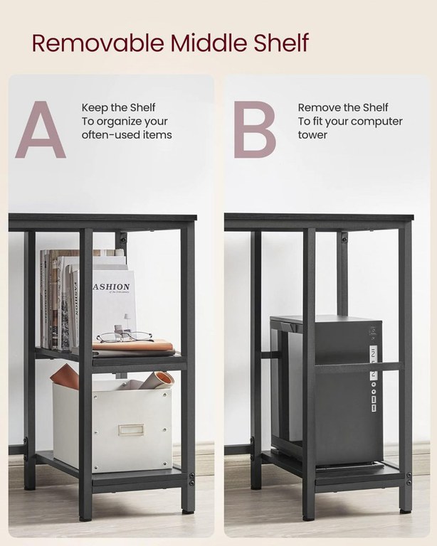 [Birou mare] Cu un birou de 138 x 138 cm, acest birou in forma de L se potriveste pentru 3 pana la 4 monitoare de calculator si va ofera o suprafata ampla pentru a lucra sau a juca jocuri pe calculator, ajutandu-va sa aveti totul la indemana. [Raft de depozitare detasabil] Raftul superior al celor 2 rafturi de depozitare deschise este detasabil. Il puteti indeparta pentru a va potrivi turnul de calculator sau il puteti pastra pentru a depozita carti, fisiere sau obiecte utilizate frecvent pentru acces usor [Colt taiat pentru a face ordine in cabluri] Coltul din spate al acestui birou de colt in forma de L este taiat pentru a permite trecerea cablurilor, ajutandu-va sa gestionati cablurile de la electronice pentru a va pastra biroul ordonat si placut ochiului [Robust si durabil] Un cadru robust din otel, combinat cu Lemn PAL de calitate, face ca acest birou de calculator sa fie robust si durabil, care suporta pana la 50 kg, oferind un suport durabil pentru munca, studiul si recreerea dvs. [Picioare reglabile practice] Picioarele reglabile mentin biroul de birou stabil pe podele inegale si va protejeaza podeaua de zgarieturi. Fluxul dvs. de spirit nu va mai fi intrerupt de clatinari enervante!