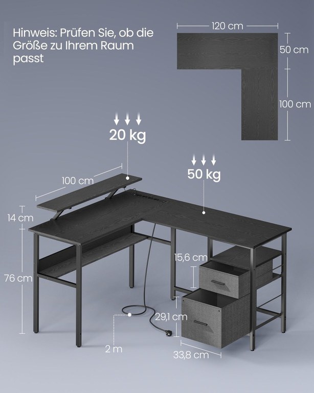 [Flexibil și multifuncțional] Acest birou în formă de L are un design reversibil, care vă permite să instalați sertarele fie pe stânga, fie pe dreapta, făcându-l perfect pentru un birou de scris, de studiu sau de jocuri. [Ambianță personalizabilă. ] Echipat cu iluminare LED încorporată, acest birou de colț oferă 20 de culori, 6 moduri de intermitent, 5 niveluri de luminozitate și 5 viteze de intermitent care vă permit să personalizați cu ușurință atmosfera camerei dvs. [Măriți-vă productivitatea] 4 AC prizele și 2 porturi USB încarcă cu ușurință telefoanele, computerele etc. Prin ridicarea ecranului la nivelul ochilor, suportul pentru monitor promovează o postură bună și reduce tensiunea gâtului. [Spațios și robust] 2 sertare și un raft asigură spațiul de lucru bine organizat. Fabricat cu un cadru de oțel și bare transversale întărite, acest birou pentru computer suportă până la 50 kg pe birou și 20 kg pe suportul pentru monitor. [Stabilitate îmbunătățită, asamblare ușoară] Picioarele reglabile asigură stabilitatea biroului în formă de L cu prize de curent și previne vibrațiile nedorite. Structura simplă, piesele numerotate și instrucțiunile clare fac asamblarea ușoară. Caracteristici : Culoare: Negru lemnos Materiale: PAL, oțel, material nețesut, material din polibuton Dimensiuni: 120 x 150 x 76 cm (D x L x H) Înălțimea produsului cu suport pentru ecran: 90 cm Greutate: 27 kg Capacitate maximă de încărcare statică a tăvii: 50 kg Capacitate maximă de încărcare statică suport pentru monitor: 20 kg Livrare : 1 x birou de jocuri 1 x kit de montare 1 x instrucțiuni de utilizare Material: PAL, oțel, material nețesut, material TC Dimensiune produs: 150x120x89 cm(桌面离地高 75) Dimensiune pachet (Lxlxh): 132,5x60x15 Greutate netă: 27 kg Greutate brută: 29,6 kg: CB192 V192 Culoare: negru