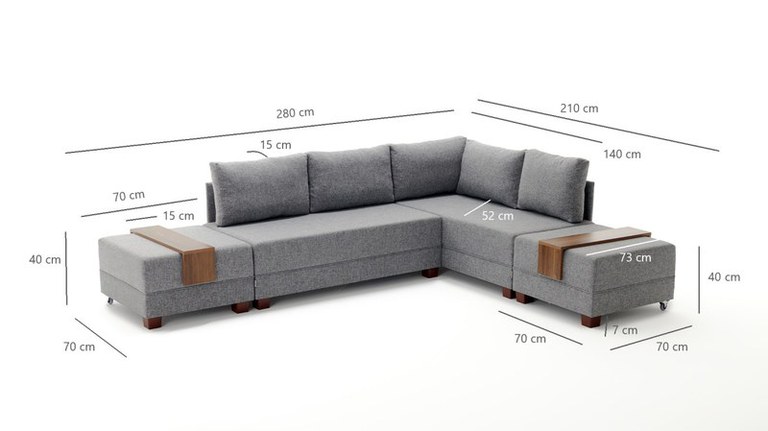 Cadru: lemn & melaminat PARTICLE PLATĂ Tesatura: 100% BUMBAC & poliester 32 DNS Spumă pentru ședere (12 cm) Picioare din lemn masiv Latime: 210 cm Înălțime: 70 cm Adâncime: 280 cm Înălțimea sezutului: 40 cm Adancime sezut: 52 cm Lungimea scaunului: 210 cm Inaltimea spatelui: 40 cm Inaltimea piciorului: 7 cm Număr de pachete: 3 145 x 80 x 56 cm / 40 kg (1 bucată) 145 x 80 x 56 cm / 40 kg (1 bucată) 70 x 70 x 70 cm / 26 kg ( 1 bucata)
