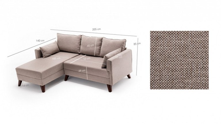 Cadru: Lemn / MDF Material: 100% Poliester Lungime: 205 cm Inaltime: 85 cm Adancime: 140 cm Sezut Inaltime: 43 cm Dimensiune Pat Extins: 140 x 80 cm Tuffet Dimensiune: 116 x 66 cm 28 Sezut din Spuma DNS 28 DNS Spuma la spatar Hard Walnut Color Picioare din Plastic Material usor de curatat