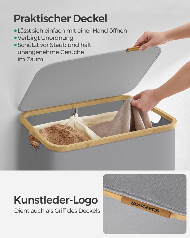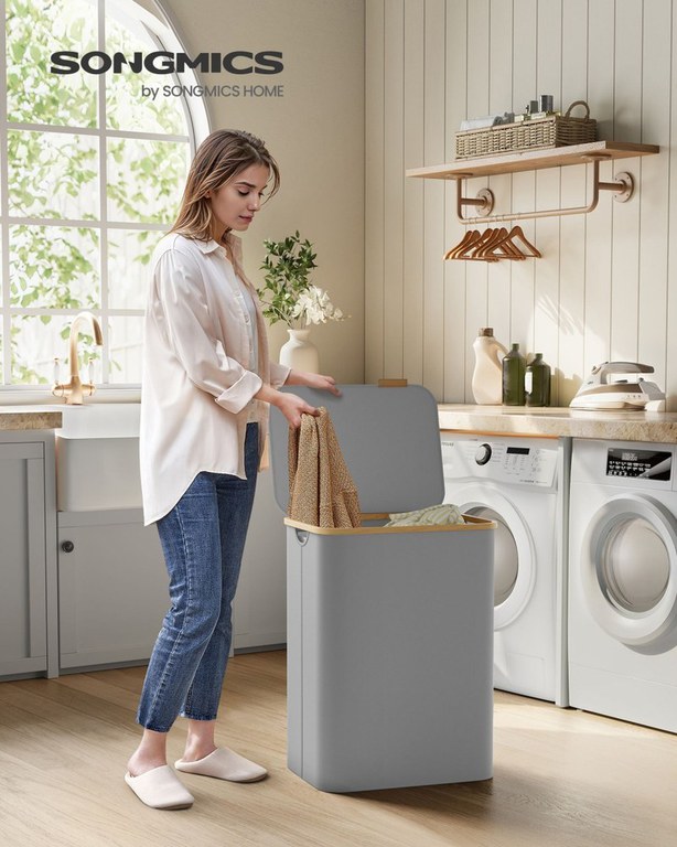 [2 compartimente spațioase] Acest coș de rufe de 130 L, care măsoară 52 x 38,5 x 70,5 cm și are 2 compartimente, este perfect conceput pentru a sorta și depozita rufele pentru o familie de trei persoane, simplificându-ți rutina de rufe.[Capac convenabil cu mâner. ] Coșul de rufe are un capac care nu numai că ține praful departe, ci și protejează intimitatea ascunzând mizeria. Logo-ul din piele artificială de pe capac servește drept mâner pentru o deschidere ușoară, adăugând o notă de eleganță.[Căptușeli detașabile și versatile] Căptușelile, asigurate cu elemente de fixare cu cârlig și buclă, pot fi îndepărtate cu ușurință, iar șnururile lor. dublează ca mânere pentru transport comod. Designul lor cu plasă le permite să servească drept sac de spălat pentru spălarea sortată în mașină.[Durabil și robust] Fabricat din țesătură Oxford groasă de 600D, coșul de rufe are rezistență la apă, rezistență la rupere și curățare ușoară. Structura sa internă, susținută de tije din fibră de sticlă, asigură stabilitatea pentru utilizarea regulată.[Ușor de asamblat] Cu instrucțiuni clare și fără unelte necesare, puteți sprijini cu ușurință acest coș de rufe în doar 5 minute.Specificații:Culoare: Negru cernealăMaterial: țesătură Oxford 600D, bambus, tije din fibră de sticlă, cartonDimensiune produs: 20,5”L x 15,2”L x 27,8”H (52 x 38,5 x 70,5 cm)< br> Greutate produs: 4,6 lb (2,1 kg)Max. Capacitate de încărcare statică: 33 lb (15 kg)Conținutul pachetului:1 x coș de rufe1 x kit de asamblare1 x instrucțiuniMaterial: bambus, țesătură Oxford, fibră de sticlă Dimensiune produs: 52x38,5x70,5 cmDimensiune pachet (Lxlxh): 52,5x39x3,5Greutate netă: 2,1 kg Greutate brută: 2,16 kgVolum: 0,00716625 CBMCuloare: Gri
