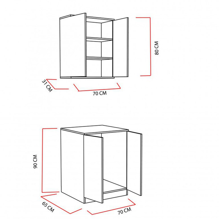 100% PAL Laminat Grosime: 18 mm Dimensiune dulap: Lățime: 70 cm Înălțime: 90 cm Adâncime: 65 cm Dimensiune dulap de perete: Lățime: 70 cm Înălțime: 80 cm Adâncime : 31 cm (1 bucată) Numeroase rafturi Poate fi fixate pe perete Numar pachete: 1 Dimensiune Pachet: 70x95x17 cm Greutate totala mobilier: 42.06 kg