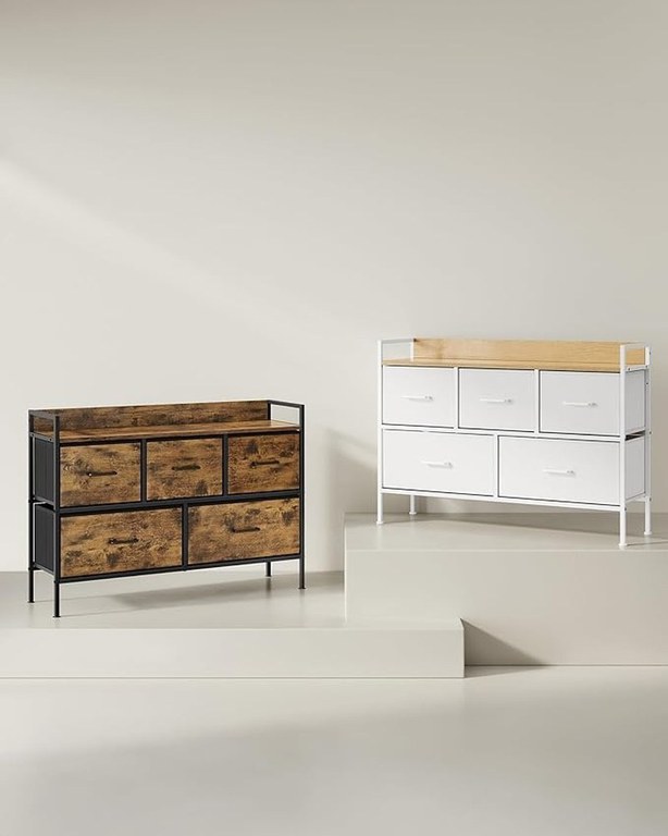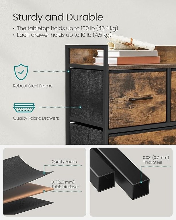 Dulap cu Sertare Songmics - Maro Rustic Îți prezentăm Dulapul cu Sertare Songmics , o soluție elegantă și practică pentru organizarea spațiului tău. Cu un design modern și funcțional, acest dulap este ideal pentru dormitor, living sau hol, aducând un plus de stil și ordine în orice încăpere. Organizare Ușoară Acest dulap dispune de 5 sertare - 3 mici și 2 mari - perfect dimensionate pentru a găzdui o varietate de articole, de la șosete și tricouri până la blugi. Astfel, sortarea și organizarea hainelor devine o activitate simplă și plăcută. Utilizare Versatilă Nu este doar un dulap pentru haine! Acest unitate multifuncțională poate fi folosită pentru a organiza accesorii în dormitor sau dressing, pentru a expune obiecte decorative sau chiar ca un suport elegant pentru televizor în living. Stabilitate și Siguranță Construit pe un cadru din otel rezistent și panouri de calitate, acest dulap poate susține până la 68 kg . Picioarele ajustabile îmbunătățesc stabilitatea, iar kitul anti-întoarcere previne răsturnarea, asigurând un mediu mai sigur pentru tine și familia ta. Asamblare Simplă Nu îți face griji în legătură cu asamblarea! Cu piese clar etichetate și instrucțiuni ilustrate incluse, montarea acestui organizator de depozitare din material textil este o joacă de copii, economisind timp și efort. Expunere Sigură Marginea ridicată de protecție de pe suprafața superioară împiedică alunecarea decorațiunilor tale, oferind un plus de siguranță pentru obiectele tale dragi. Afișează-ți cu încredere articolele preferate! Detalii Tehnice Culoare: Maro Rustic, Negru Cerneală Material: PAL, Lemn MDF (Lemn cu Densitate Medie), Oțel, Poliester, Material Nețesut Dimensiuni produs: 98.2 x 29 x 70 cm Greutate produs: 11.2 kg Capacitate maximă de încărcare a fiecărui sertar: 4.5 kg Capacitate maximă de încărcare a suprafeței superioare: 45.4 kg Dimensiuni pachet: 104 x 37 x 15 cm Comandă Acum! Nu rata ocazia de a adăuga acest dulap cu sertare elegant și funcțional în casa ta! Comandă acum și transformă-ți spațiul într-un loc ordonat și plin de stil!