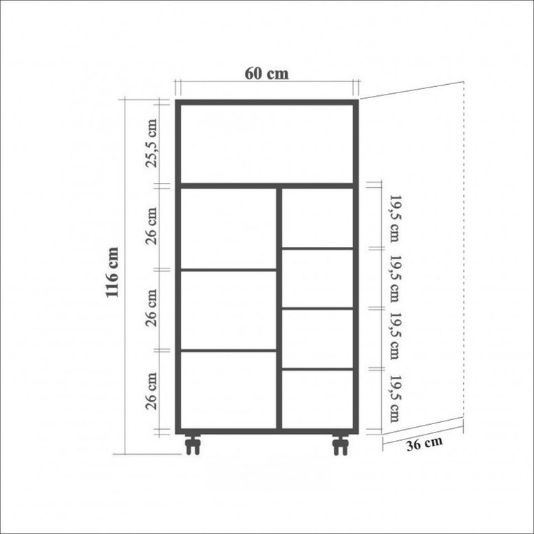 PAL Laminat 100% Grosime: 18 mm Picioare rulante Acoperire UV Lungime: 60 cm Inaltime: 116 cm Adancime: 36 cm Raft Inaltime: 26 cm Rafturi Numeroase Poate fi fixat pe perete Spatiu de Depozitare mare Numar de Pachete: 3 121 x 41 x 12 cm / 30 kg (1 Bucata) 86 x 37 x 6 cm / 8 kg (1 Bucata) 15 x 15 x 35 cm / 2 kg (1 Bucata)