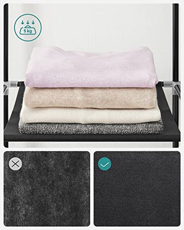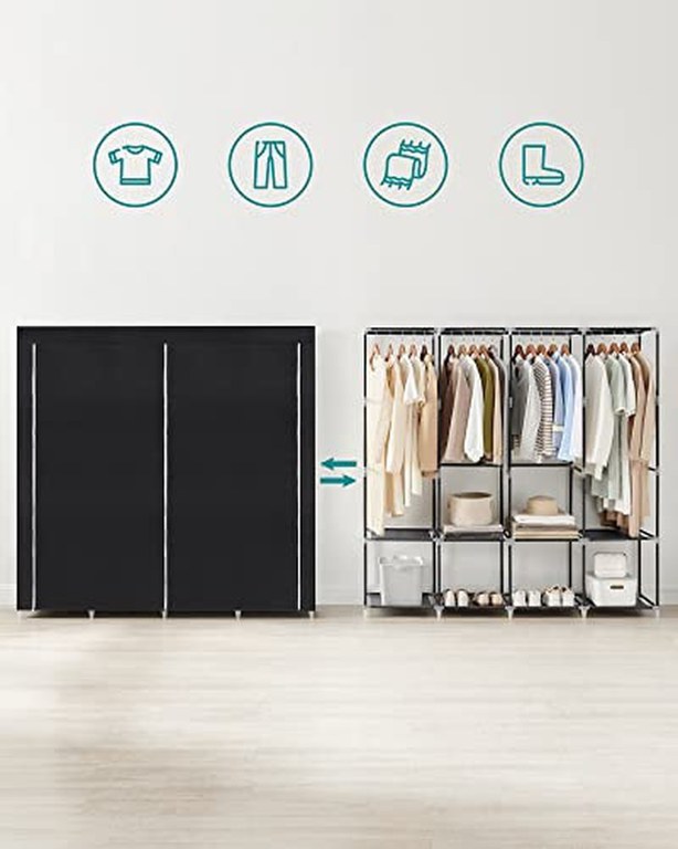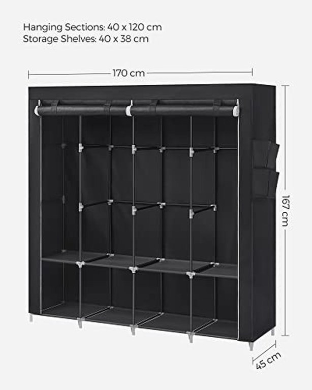 Rafturi si rafturi pentru haine: Acest dulap are 4 sectiuni de agatat cu o inaltime maxima de agatare de 120 cm pentru a va pastra camasile, paltoanele si fustele fara riduri si rafturi pentru depozitarea pantofilor sau a gentilor. Capacitate mare, mai multe surprizeProiectare detaliata: Acest dulap din material textil este prevazut cu 4 buzunare de depozitare pe o parte pentru depozitarea obiectelor mici, cum ar fi sosete, chei si manusi. Nu va trebui sa scotociti in cautarea lucrurilor mici atunci cand va grabiti sa iesiti in orasRobust, cu o capacitate de incarcare mare: Fabricat cu tuburi de otel cu diametrul de 16 mm si imbinari din plastic armat, acest suport de haine ofera un suport solid pentru hainele dvs. (sarcina statica maxima pe tija: 15 kg).Usor de asamblat: Nu este nevoie sa pregatiti niciun instrument de asamblare. Tot ce trebuie sa faceti este sa uniti tuburile metalice cu conectori din plastic si sa puneti husa din tesatura - veti putea asambla acest dulap independent intr-un timp scurtCe se afla in cutie: Un dulap din material textil cu 4 sectiuni de agatat si 4 buzunare laterale, un kit antistrapungere, instructiuni detaliate si clare si o modalitate de a va pastra camera curata si ordonata.