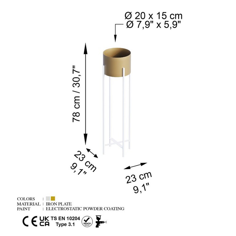 100% METAL Lățime: 23 cm Înălțime: 78 cm Adâncime: 23 cm Diametru ghiveci: 20 cm Înălțime ghiveci: 15 cm Greutate: 1.398 kg Accesoriile folosite la ședința foto nu sunt incluse în pachet. Produsul nu necesită instalare.