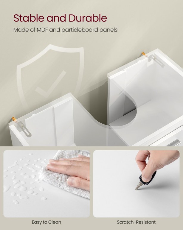 Masca lavoar Vasagle 60x30x60 cm — Organizare compactă cu stil Design modern și materiale de calitate Linia pură și nuanța caldă de alb conferă băii tale o ambianță netedă și luminoasă, astfel încât mobilierul devine atât vizibil, cât și discret în același timp. Construită din MDF și PAL melaminat , masca promite o atingere plăcută și o rezistență sporită la uzură, oferind durabilitate și estetică premium care îmbogățește decorul. Datorită finisajului ușor de curățat, acest corp de mobilier aduce un aer de rafinament fără să sacrifice funcționalitatea. Funcționalitate și organizare Cele două compartimente spațioase ascunse în spatele ușii optimizează instantaneu ordinea din baie, iar polița reglabilă pe 3 niveluri îți permite să depozitezi atât sticle înalte, cât și recipiente mici, astfel încât fiecare lucru are locul său. Produsul se potrivește pentru lavoare cu sau fără picior, însă este esențial să verifici dimensiunea decupajului pentru sifon și lățimea reală a corpului pentru a te asigura că se potrivește nevoilor tale; decupajul pentru sifon are dimensiunea de 20 x 14,8 cm. Prin organizare eficientă, această mască protejează și ascunde cosmeticele, prosoapele și produsele de curățenie, oferind spațiu , versatilitate și optimizare în fiecare zi. Montaj și întreținere Montajul este conceput pentru a fi accesibil, iar setul include toate accesoriile necesare împreună cu un kit anti-răsturnare care îmbunătățește stabilitatea și siguranța, astfel încât poți folosi mobila liniștit în preajma familiei. Curățarea se face ușor cu o cârpă moale umezită; evită substanțele abrazive pentru a păstra stratul melaminat intact și a prelungi durabilitatea finisajului. În plus, datorită construcției solide și materialelor atent alese, produsul oferă siguranță , stabilitate și întreținere simplificată. Comandă acum Adaugă masca în coș și transformă-ți baia într-un spațiu ordonat și rafinat — livrare rapidă și montaj facil. Detalii tehnice complete Dimensiuni și greutate Dimensiuni produs: 60 x 30 x 60 cm Greutate produs: 10.8 kg Dimensiuni decupaj sifon: 20 x 14.8 cm Capacitate maximă: 60 kg Materiale și caracteristici Material corp: MDF și PAL melaminat Culoare: Alb Montaj și pachet Stare asamblare: Neasamblat Conținut pachet: 1 x Masca lavoar, 1 x Kit anti-răsturnare, 1 x Accesorii de montaj, 1 x Manual de utilizare (limba engleză nu garantată) Stil și origine Stil: Modern / Minimalist Destinație recomandată: Baie Informații importante Mobilierul este proiectat pentru a se potrivi cu diverse tipuri de lavoare, cu sau fără picior; totuși, verifică înainte dimensiunile reale ale decupajului pentru sifon și lățimea mobilierului pentru a te asigura că se potrivește în spațiul disponibil. Manualul din pachet poate să nu fie disponibil în limba română, astfel încât este recomandat să studiezi instrucțiunile de asamblare cu atenție sau să soliciți asistență la montaj. În plus, folosește obligatoriu kitul anti-răsturnare pentru a mări stabilitatea și siguranța, mai ales în locuințele cu copii.