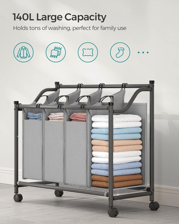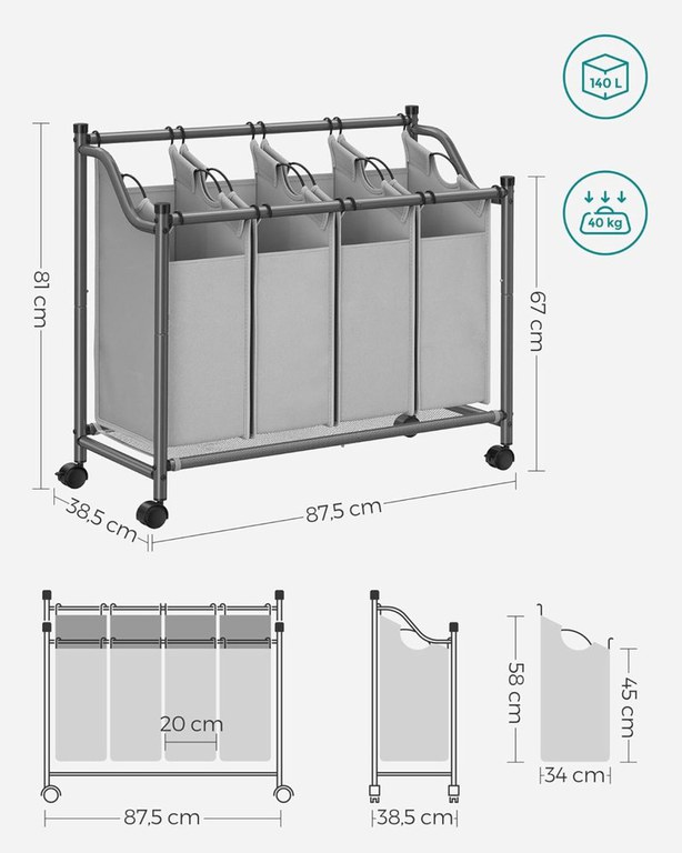 Organizator cu roti pentru baie, Songmics, 4 x 35L, 87.5 x 38.5 x 67 cm, LSF005, Gri