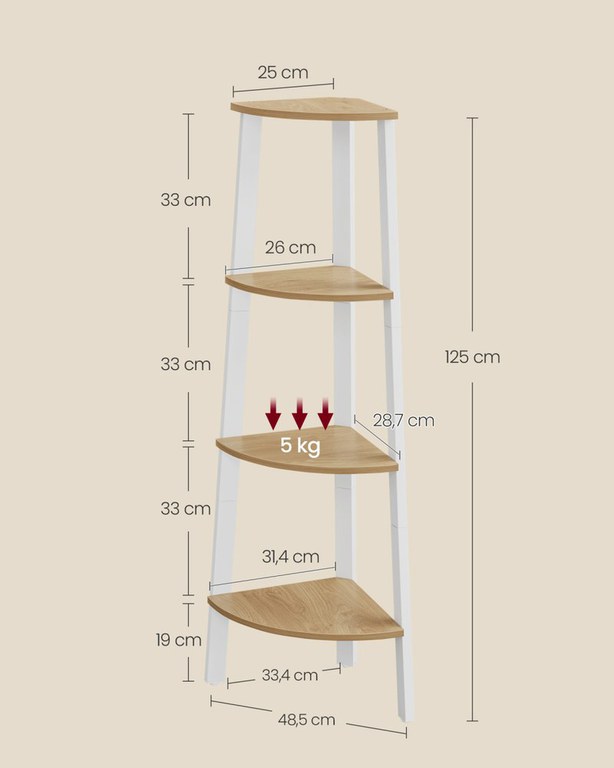 [Un raft pentru fiecare cameră] Umpleți un colț gol din camera dvs. de zi, utilizați-l ca suport de plante de colț în birou pentru verdeață sau cuibăriți-l în intrare, sufragerie sau dormitor... această unitate de raft de colț poate veni în plin joc. [Profitați la maximum de spațiul din colț] Această unitate de rafturi cu 4 niveluri, care măsoară 33,4 x 33,4 x 125 cm, este concepută pentru a vă ajuta să utilizați pe deplin spațiul din colț. Îl puteți folosi pentru a vă organiza și prezenta eficient cărțile, plantele, decorațiunile și multe altele. [Asamblarea făcută într-o clipă] Datorită instrucțiunilor clare, pieselor etichetate și găurilor pre-găurite în tuburile metalice pentru fixarea fără efort în șuruburi, veți instala acest raft de colț în cel mai scurt timp. [Design stabil și sigur] Cu designul său cu 3 picioare și un picior din spate reglabil, această unitate de raft de colț este ușor stabilă. podele neuniforme și se potrivesc perfect pe orice perete. În plus, un kit anti-răsturnare oferă un plus de siguranță. [Servește un stil bun] Invită vibrații industriale cu rafturile sale din stejar natural și cadrul metalic alb; această unitate de rafturi de colț va da un plus de stil oricărei case care caută decorare sau renovare.Specificații: Culoare: Stejar natural, Alb Mat Material: Plăci PAL, Oțel Dimensiune produs: 13,1" D x 13,1" L x 49,2" H (33,4 x 33,4 x 125 cm) Greutate produs: 12,1 lb (5,5 kg) Capacitate maximă de încărcare statică a fiecărui nivel: 11 lb (5 kg)< br> Conținutul pachetului: 1 x poliță de colț 1 x kit de accesorii 1 x kit anti-răsturnare 1 x instrucțiuniMaterial: PAL, oțelDimensiunea produsului : 33,4x33,4x124,5 cmDimensiune pachet (Lxlxh): 43,5x33x10Greutate netă: 5,2 kg Greutate brută: 5,6 kgVolum: 0,014355 CBMCuloare: maro, alb