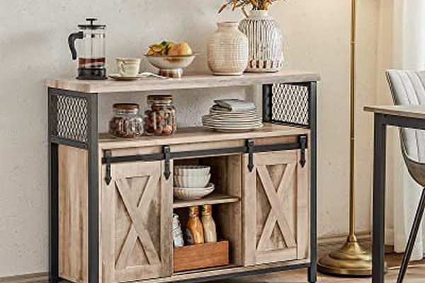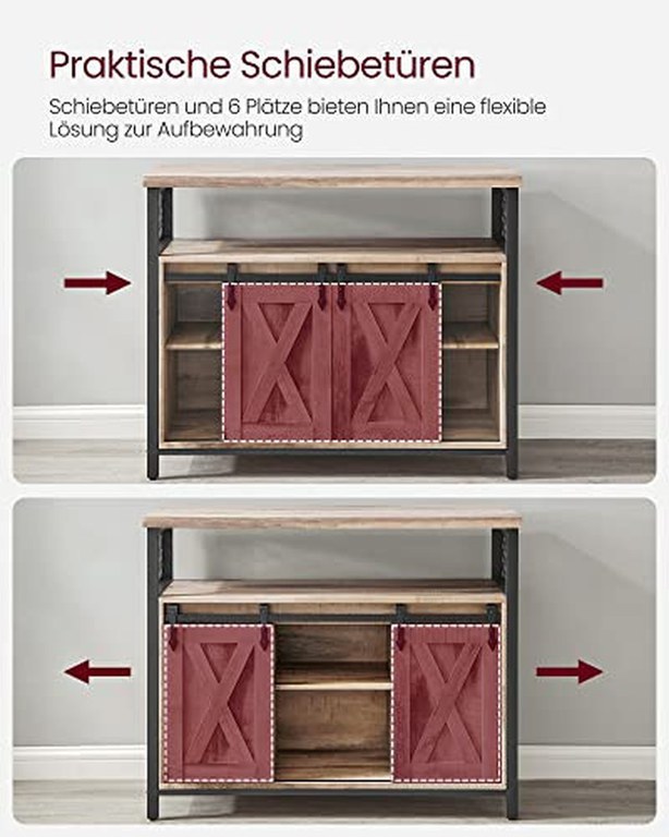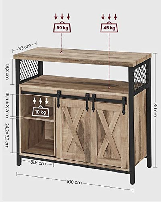 [Usi glisante unice] Usi rustice, aranjament simetric - cele doua usi glisante dau acestui dulap de bucatarie un stil de casa de tara care poate fi usor integrat in multe stiluri de interior. Stocare flexibila: 6 locuri si trei rafturi cu inaltime reglabila pe 3 niveluri (de asemenea, detasabile) pentru obiecte de diferite dimensiuni; blat de masa de 33 x 100 cm pentru mai multe optiuni Robust si robust: combinatia dintre aschiile de lemn si cadrul metalic de inalta calitate confera masutei un nivel ridicat de stabilitate si rezistenta. Picioarele reglabile mentin dulapul echilibrat, in timp ce protectia impotriva inclinarii ofera un plus de stabilitate Versatilitate: utilizati acest dulap de depozitare ca un dulap in bucatarie, ca un dulap de hol pentru obiecte mici, ca un dulap TV in camera de zi sau ca un dulap de arhivare in biroul de acasa [Usor de instalat] Datorita instructiunilor clare si a pieselor marcate, asamblarea acestui dulap de bucatarie este foarte usoara. Sunt incluse si suruburi de inlocuire