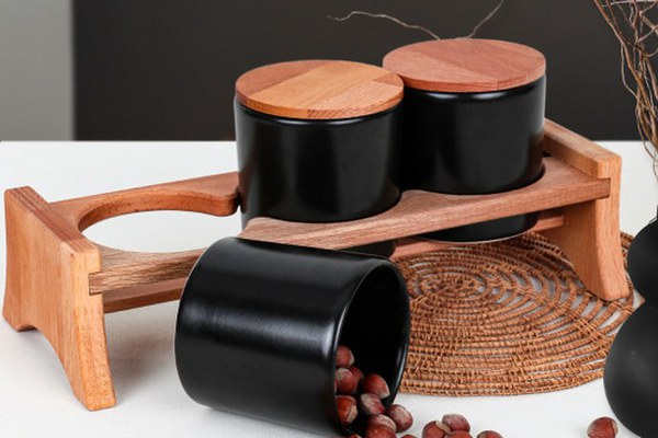 Set 3 cutii de depozitare alimente 100% ceramică Antibacterian Prietenos cu mediul Dimensiune: 10 x 10 x 10 cm / 620 ml (3 bucăți) Stand de lemn (1 bucată) Poate fi spălat în mașina de spălat vase