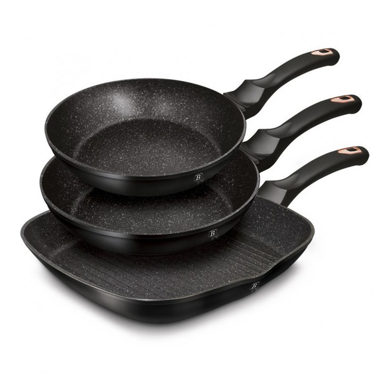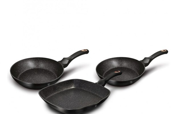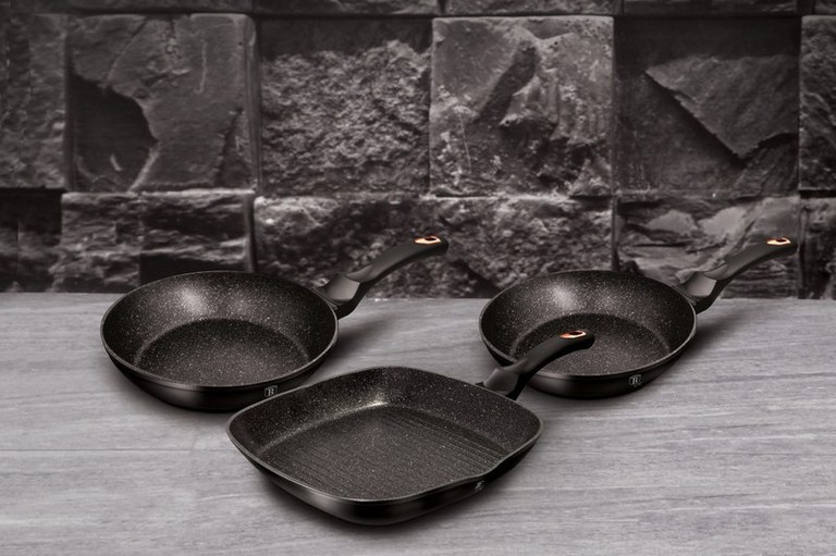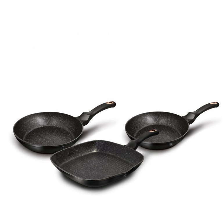 Material: aluminiu forjat Include: Tigaie Ø20*4,5 cm 1,0L Tigaie Ø24*4,8 cm 1,7L Tigaie grill Ø28*4,1 cm 2,1L Culoare: negru mat- rose gold