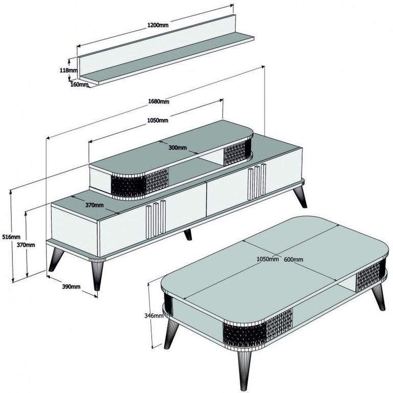 PAL Laminat 100% Grosime:18 mm Dimensiuni: Lungime: 168 cm Inaltime: 51,6 cm Adancime: 39 cm Dimensiuni: Lungime: 105 cm Inaltime: 14, 6 cm Adancime: 30 cm Dimensiuni perete: Lungime: 120 cm Inaltime: 11,8 cm Adancime: 16 cm Coffee Table Size: Lungime: 105 cm Inaltime: 34,6 cm Adancime: 60 cm Rafturi Numeroase Poate fi fixat pe perete Numar de Pachete: 4 175 x 45 x 13 cm / 34,25 kg (1 Bucata) 26 x 21 x 16 cm / 2 kg (1 Bucata) 111 x 66 x 7 cm / 17 kg (1 Bucata) 26 x 21 x 16 cm / 2 kg (1 Bucata)