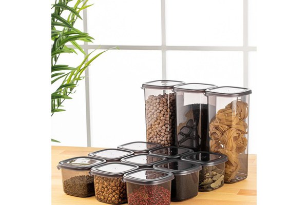 100% plastic Dimensiune: 10 x 10 x 9,5 cm / 550 ml (9 bucăți) Dimensiune: 10 x 10 x 24,5 cm / 1750 ml (3 bucăți) Mașina de spălat vase - sigur Cuptorul cu microunde - nu este sigur Fără BPA