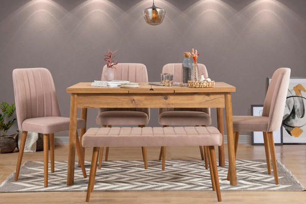 100% PAL LaminatGrosime: 18 mmPicioare din lemnMasa de sufragerie: Lățime: 120 cm Înălțime: 75 cm Adâncime: 75 cmMasa deschisă: Lățime: 155 cm Înălțime: 75 cm Adâncime: 75 cmCadru scaun: METALTesatura scaun: 100% SPUMĂ POLIUURETANICScaun (4 bucăți): Lățime: 47 cm Înălțime: 90 cmScaun Înălțimea scaunului: 49 cmCadru băncii: METALTesatura băncii: 100% SPUMĂ POLIURETANICBanca (1 bucată): Lățime: 100 cm Înălțime: 48 cm Adâncime: 39 cmNumar pachete: 6Size: 79 x 126 x 16 cm / 25 kg (1 Bucata)Size: 50 x 60 x 55 cm / 12,5 kg (4 Bucati)Size: 46 x 102 x 41 cm / 8,5 kg (1 Bucata)Dimensiune Pachet: 126x79x157 cmGreutate totala mobilier: 83.5 kg
