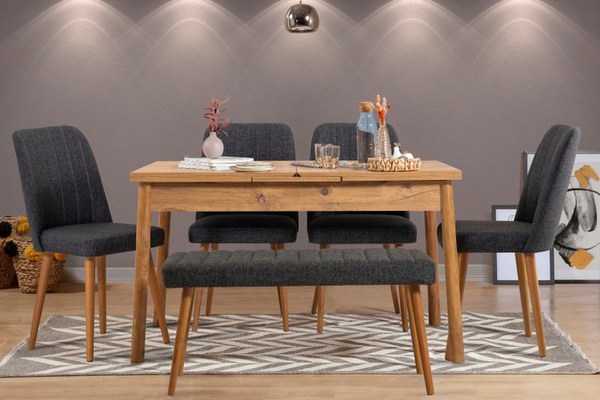 100% PAL LaminatGrosime: 18 mmPicioare din lemnMasa de sufragerie: Lățime: 120 cm Înălțime: 75 cm Adâncime: 75 cmMasa deschisă: Lățime: 155 cm Înălțime: 75 cm Adâncime: 75 cmCadru scaun: METALTesatura scaun: 100% SPUMĂ POLIUURETANICScaun (4 bucăți): Lățime: 47 cm Înălțime: 90 cmScaun Înălțimea scaunului: 49 cmCadru băncii: METALTesatura băncii: 100% SPUMĂ POLIURETANICBanca (1 bucată): Lățime: 100 cm Înălțime: 48 cm Adâncime: 39 cmNumar pachete: 6Size: 79 x 126 x 16 cm / 25 kg (1 Bucata)Size: 50 x 60 x 55 cm / 12,5 kg (4 Bucati)Size: 46 x 102 x 41 cm / 8,5 kg (1 Bucata)Dimensiune Pachet: 126x79x157 cmGreutate totala mobilier: 83.5 kg