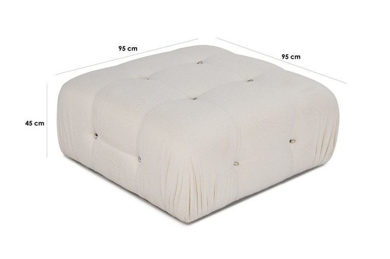 Descoperiți Taburetul Bubble Alb - Confort și Stil într-un Singur Produs Adăugați o notă de eleganță și confort în spațiul dumneavoastră cu Taburetul Bubble Alb . Conceput pentru a oferi o experiență de ședere plăcută , acest taburet este o alegere excelentă pentru orice decor modern sau tradițional. Cu dimensiunile generoase de 95x95 cm și o înălțime de 45 cm, Taburetul Bubble Alb este perfect pentru relaxare. Fabricat din materiale de calitate superioară , acesta include un cadru robust din lemn de fag și pal , acoperit cu un material textil 100% poliester , ușor de întreținut și curățat chimic. Confortul este asigurat de spuma cu densitate DNS de 28 pentru spate și o combinație de spumă DNS de 24 și arcuri pentru o ședere mai confortabilă. Adâncimea generoasă a șezutului, de 65 cm, permite o relaxare totală, fie că citiți o carte sau vă bucurați de o ceașcă de cafea. Picioarele din plastic negru mat adaugă un aspect elegant și sunt concepute pentru a asigura stabilitate și durabilitate. Datorită designului său modular, taburetul poate fi personalizat cu alte unități modulare, permițându-vă să creați configurația perfectă pentru spațiul dumneavoastră. Detalii Tehnice: Culoare: Alb Material Cadru: Lemn de fag, Pal Material Textil: 100% Poliester, curățabil chimic Dimensiuni: Lungime: 95 cm, Lățime: 95 cm, Înălțime: 45 cm Densitate Spumă: 28 DNS pentru spate, 24 DNS cu arcuri pentru șezut Adâncime Șezut: 65 cm Picioare: Plastic negru mat Greutate Produs: 13 kg Dimensiune Colet: 98x98x49 cm Număr Colete: 1 Alegeți Taburetul Bubble Alb pentru a adăuga un plus de stil și confort în casa dumneavoastră. Este perfect pentru orice cameră și se integrează armonios în diverse decoruri. Comandați acum și transformați orice colț într-un spațiu de relaxare deosebit!
