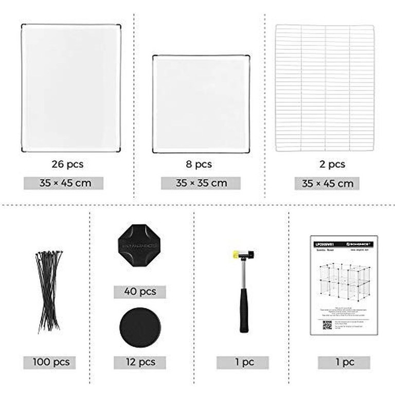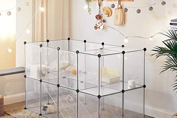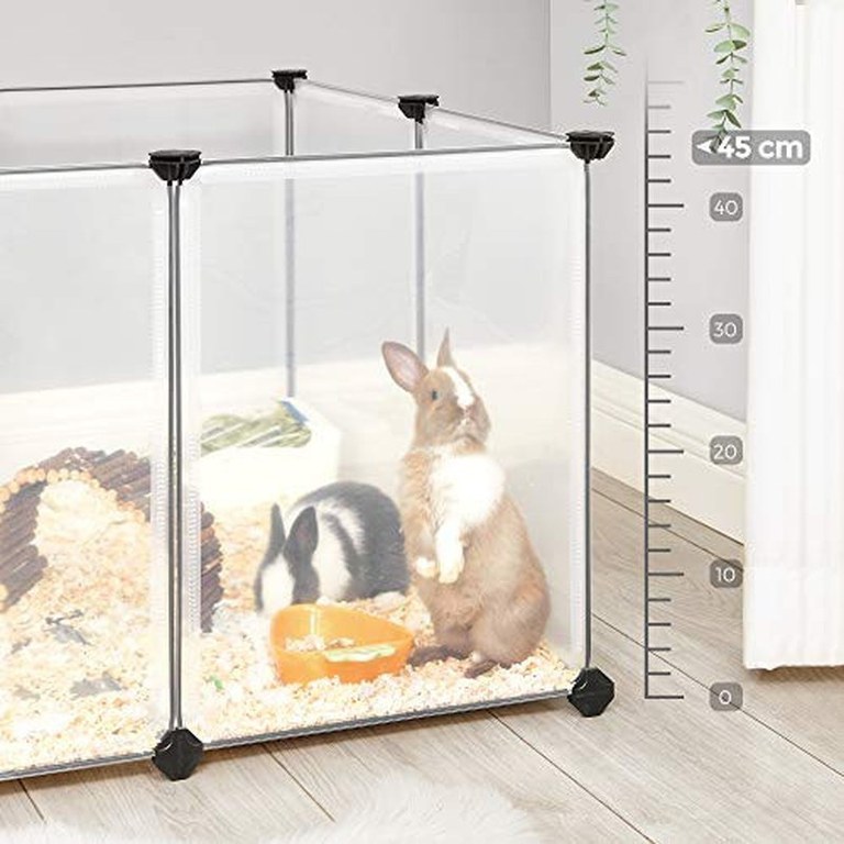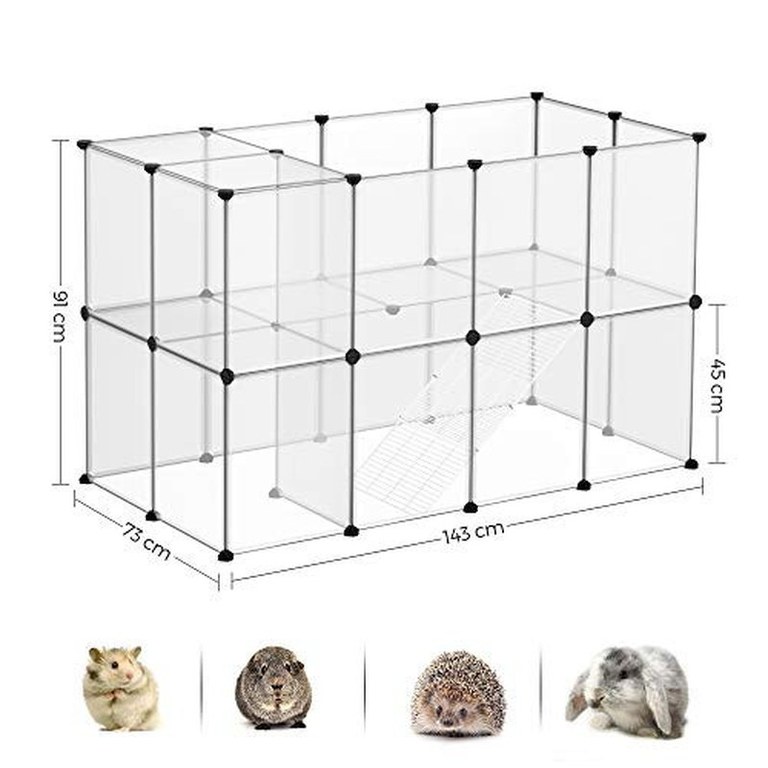 Sunt atat de fericita acum! "Hei, umanul meu, iti multumesc mult ca mi-ai facut cadou o casuta de joaca atat de spatioasa (143 x 73 x 91 cm)! Camere, scari si o terasa - acesta este intr-adevar un paradis minunat pentru mine sa alerg, sa ma joc, sa fac miscare si sa ma distrez! " Sunt destul de in siguranta aici: "Peretii suprainaltati (45 cm inaltime), peretii netezi din panouri de plastic si designul fara cusur al colturilor imi ofera un loc sigur si securizat pentru distractie, asa ca nu trebuie sa va faceti griji ca voi fugi sau ma voi rani!" Imi place curatenia! "Prin panourile transparente, m-ati vazut cum ma ingrijesc din nou? Da. Iubesc frumusetea si curatenia! Deci, ai putea sa ma ajuti sa pastrez casa curata? O simpla stergere cu o carpa umeda si gata! Usor-usor!" Va puteti distra si voi! "Mi-ar placea ca si tu sa faci parte din timpul meu de joaca! Asa ca am ales aceasta casa de bricolaj. O poti configura in diferite forme (in limitele pieselor incluse) prin simpla imbinare a panourilor cu ajutorul conectorilor multi-unghi" Ce primesti: Toate panourile din plastic, conectorii si legaturile de cablu necesare, 12 tampoane antiderapante, 2 scari din plasa metalica cu o distanta de 1,3 cm intre grile si 1 ciocan de cauciuc pentru a personaliza un tarc de joaca distractiv pentru porcusori de Guineea, hamsteri sau alte animale de companie de mici dimensiuni.