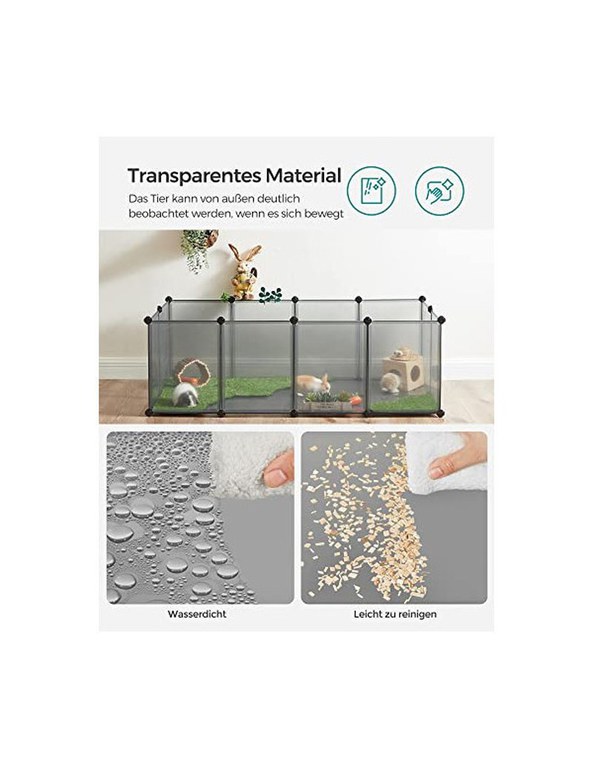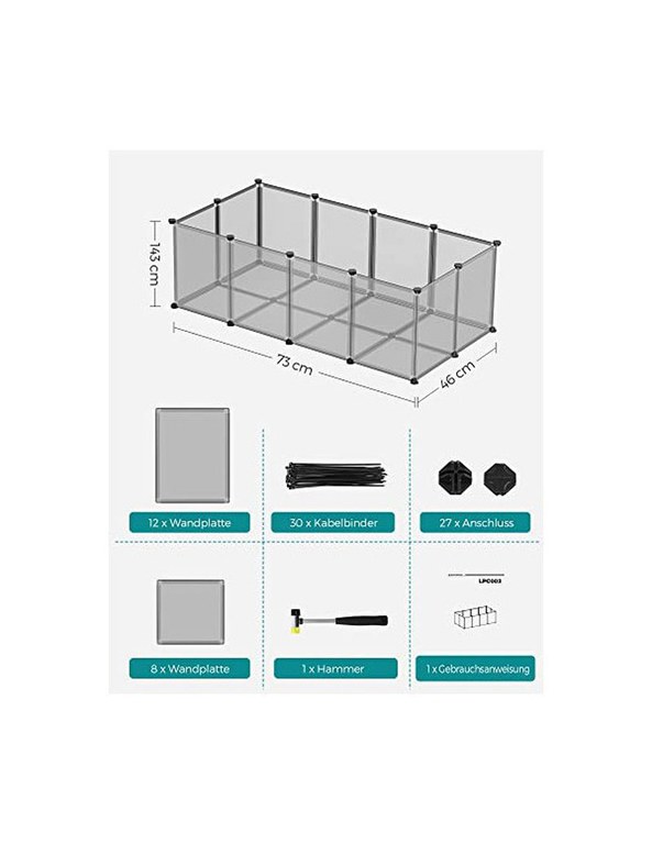 •Specificatii: •Culoare: Gri •Material: PP •Dimensiuni: 143 x 73 x 46 cm (L x W x H) •Greutate: 4.2 kg •Pachetul contine:12 x panou din plastic (45 x 35 cm)- 8 x panou din plastic (35 x 35 cm)- 27 x conector din plastic - 30 x prindere cablu - 1 x ciocan - 1 x instrucțiuni