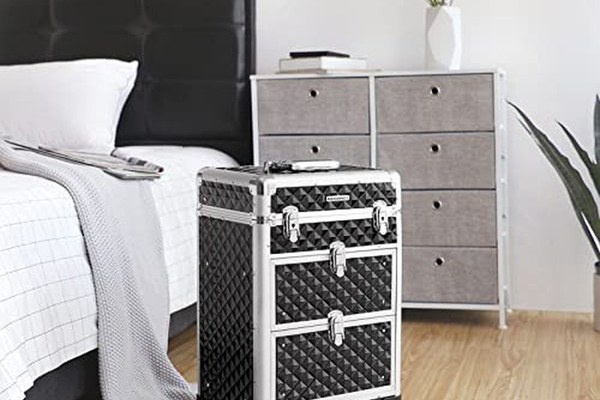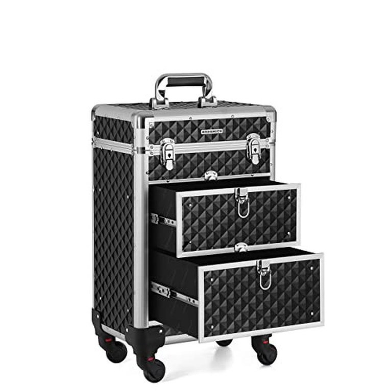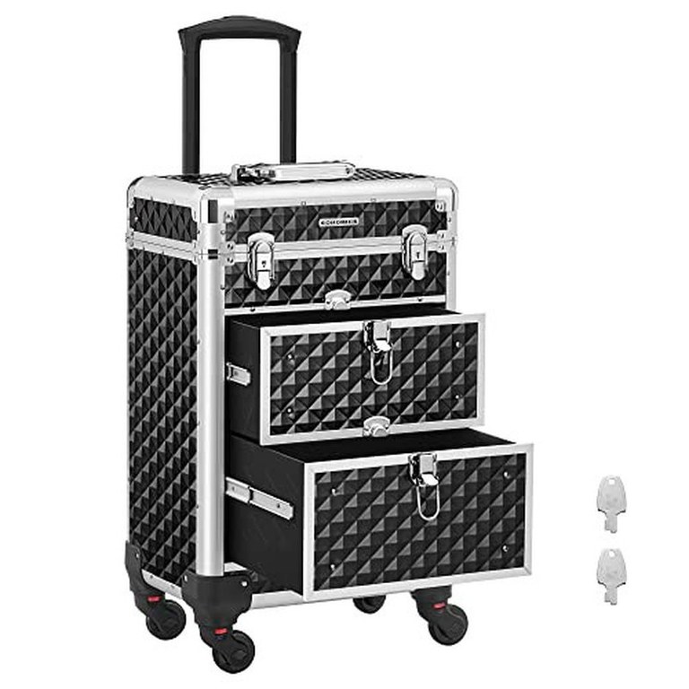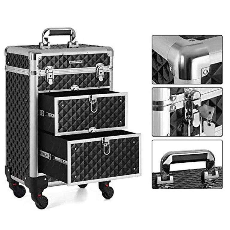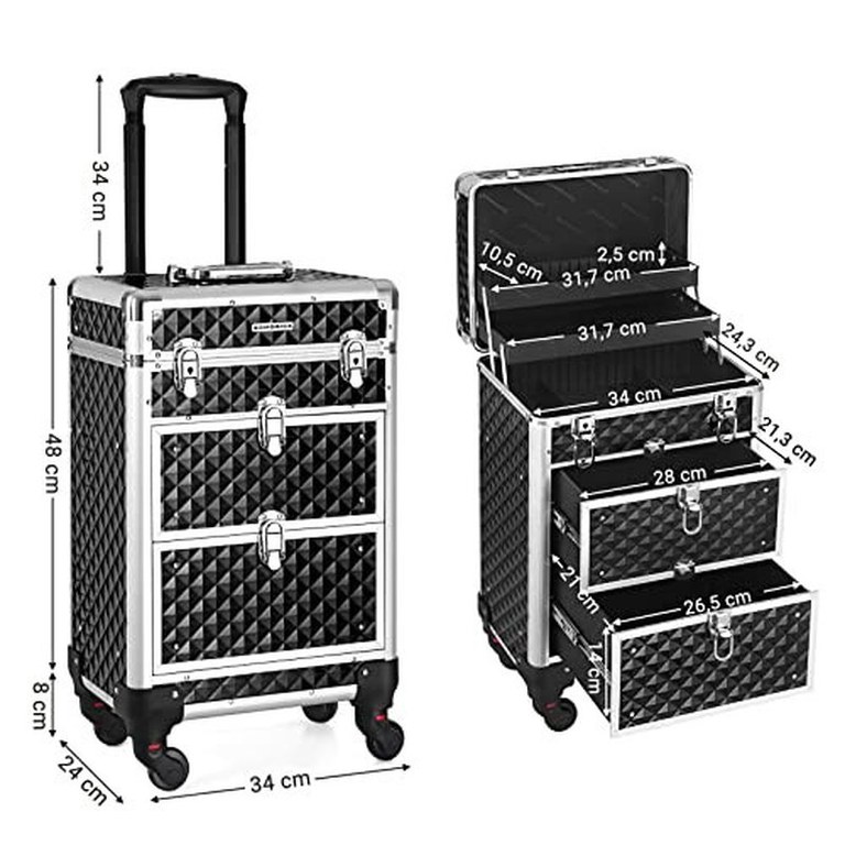 3 Tavite se deschid automat: Partea superioara a caruciorului se pliaza in timp ce este atasata la partea superioara a valizei, astfel incat nu trebuie sa detasati fiecare sectiune pentru a le deschide, ceea ce va ajuta sa gasiti usor si rapid produsele cosmetice; partitii detasabile pentru a depozita lucruri mici, cum ar fi lac de unghii, ruj, role de par etc. 2 sertare glisante pentru depozitarea mobila: 2 sertare pentru a depozita diverse obiecte si pot fi scoase cu usurinta cu ajutorul unor stopuri care aluneca usor pe sine pentru a avea acces usor la obiectele dvs. 4 rotile SWIVEL 360° SWIVEL REMOVIBILE: rotile universale rezistente si de economisire a fortei de munca pentru o mobilitate usoara; partener de calatorie portabil ideal; apasati usor stifturile care se afla pe partea laterala a rotilor pentru a le detasa si a le inlocui BLOCABIL CU CHEILE: 2 zavoare durabile cu 2 chei in partea de sus a carcasei va pastreaza obiectele de valoare mult mai sigure atunci cand impartiti un vestiar cu altii sau intr-o calatorie TROLETIN COSMETIC STYLISH SI REZISTENT: Granulatia neagra a cubului de apa combinata cu suprafata ABS il face sic si usor; cadrul stabil din aluminiu are o rezistenta mai buna la impact, garantand in acelasi timp capacitatea de incarcare (0-50 kg) a acestei truse de machiaj