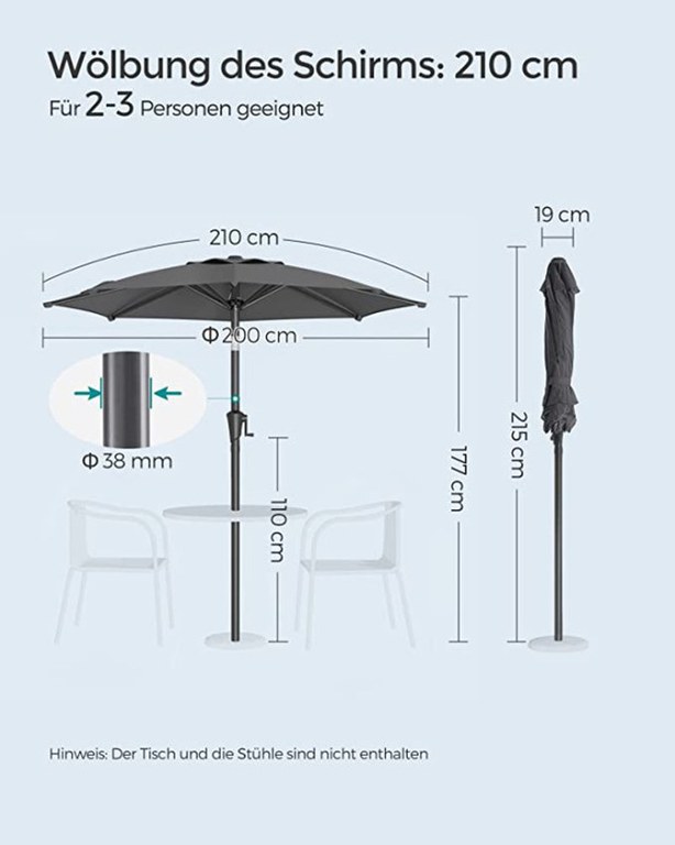 [Ușor de deschis și închis] Pur și simplu rotiți manivela pentru a deschide și închide umbrela de soare. Rapid și ușor [Poate fi înclinată pe ambele părți] Umbrela poate fi înclinată cu 30° pe ambele părți. Pur și simplu apăsați butonul de pe articulație pentru a înclina umbrela. Înclinați umbrela în funcție de momentul zilei, astfel încât să puteți fi bine protejat toată ziua Protecție împotriva soarelui și a ploii burnițe: umbrela de plajă din poliester de 180 g/m² oferă protecție solară excelentă de UPF 50+ și blochează mai mult de 98% din razele UV fără probleme. De asemenea, este hidrofug și rezistent la burniță Nerve stabile și durabile: nervurile umbrelei de grădină sunt fabricate din oțel de înaltă calitate, acoperite cu pulbere, sunt robuste, stabile, rezistente la rugină și asigură o durată lungă de viață Potrivit pentru diferite scenarii: umbrela de soare de 210 cm oferă suficientă umbră pentru 2-3 persoane în grădină, pe terasă, pe balcon sau lângă piscină