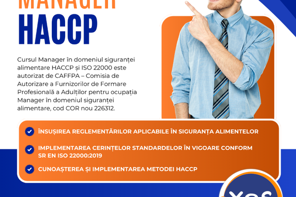 Cursul Manager în domeniul siguranţei alimentare HACCP şi ISO 22000, organizat de Top Quality Management, este autorizat de CAFFPA – Comisia de Autorizare a Furnizorilor de Formare Profesională a Adulţilor pentru ocupaţia Manager în domeniul siguranţei alimentare, cod COR nou 226312. Tematica programului de formare: - Noţiuni generale privind calitatea produselor alimentare şi managementul calităţii; - Sistemul HACCP: istoric, evoluţie, definiţie, principii, implementare sistem; - Referinţe normative şi legislative aplicabile în industria alimentară; - Sistemul de igienă al unei organizaţii din industria alimentară; - Analiza HACCP: definire pericol, risc, metode de lucru ce stau la baza identificării punctelor critice de control; - Întocmire plan HACCP; - Sistem de trasabilitate; - Prezentarea cerinţelor standardului ISO 22000; - Relaţia dintre ISO 9001 şi ISO 22000. Pentru mai multe informații despre acest curs vă rugăm să accesați website-ul www.cursuriautorizate.ro sau să ne contactați telefonic la numărul [Telefon]