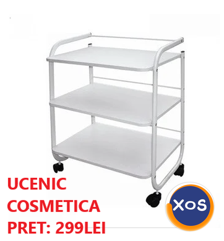Ucenic cosmetic are culoarea alba, este confectionat din metal vopsit si cu politele din lemn. Cele trei polite sunt suficient de incapatoare pentru aparatura cosmetica fara stand.